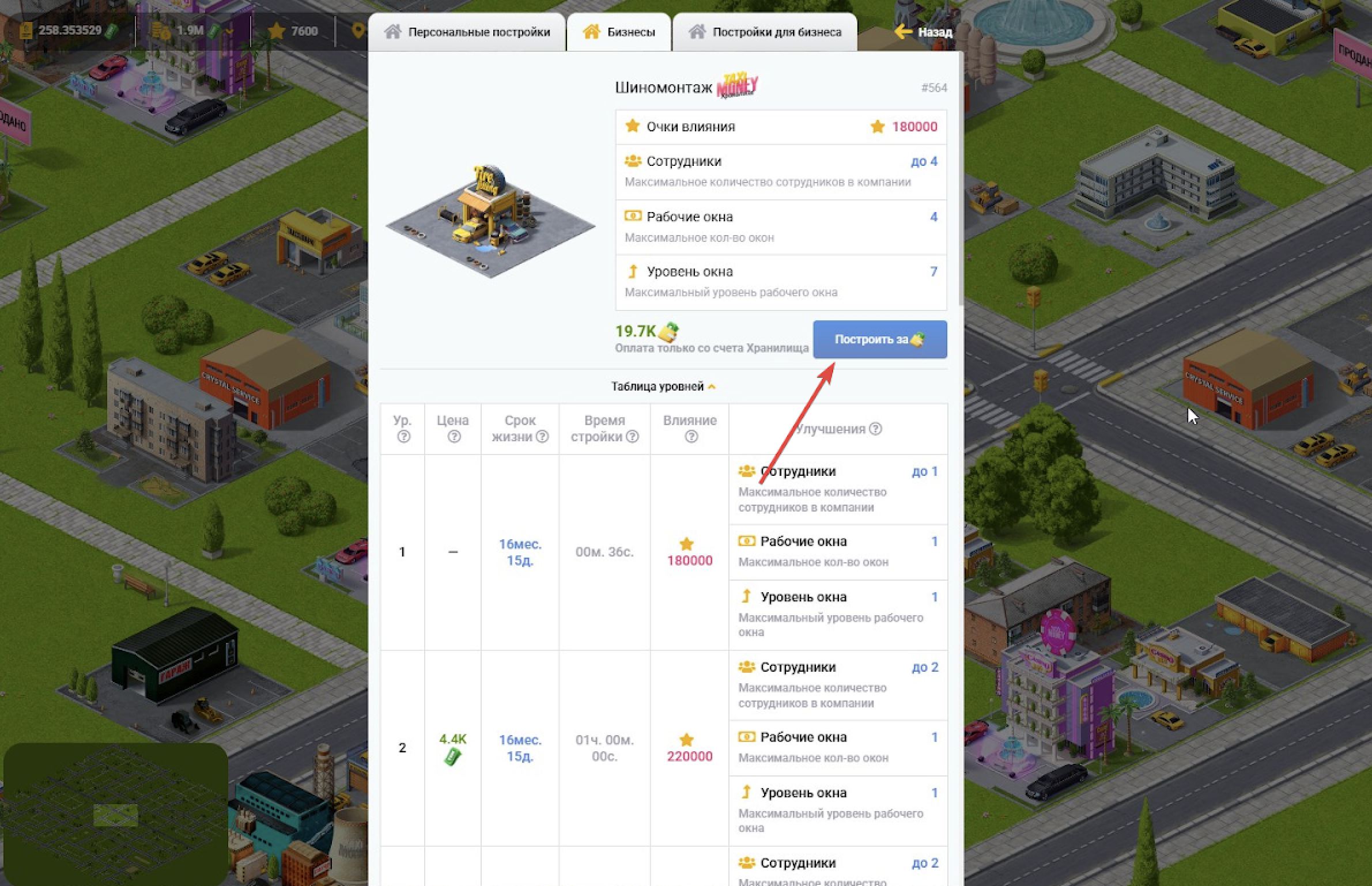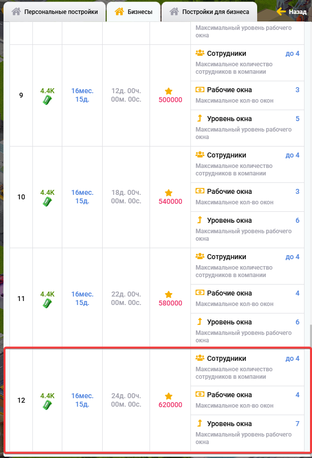 1. Прокачивайте уровень здания и увеличивайте количество доступных рабочих мест, усиливайте влияние и зарабатывайте больше!