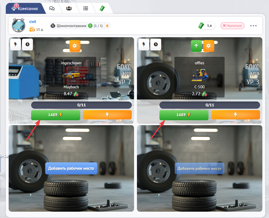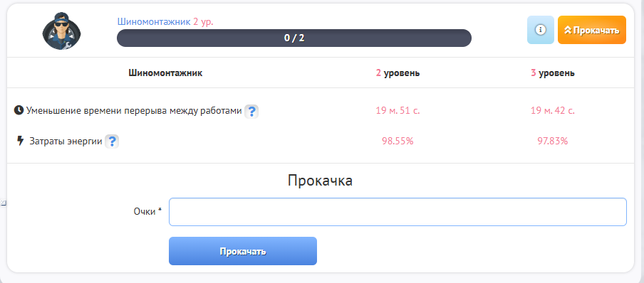Также за работу в “Шиномонтажке” Ваш навык “Шиномонтажника” будет автоматически улучшатся, что позволит Вам сократить расход энергии во время работы и с каждым новым уровнем навыка Ваша личная перезарядка будет сокращаться.