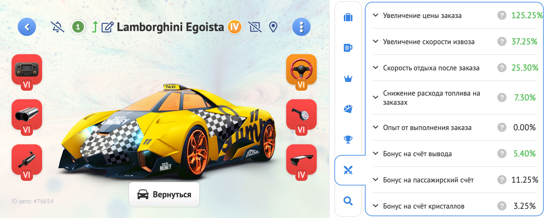 • Первое такси 2-го ранга с возможностью модификации любых бонусов под твою стратегию — настрой машину для заработка так, как это нужно именно тебе!